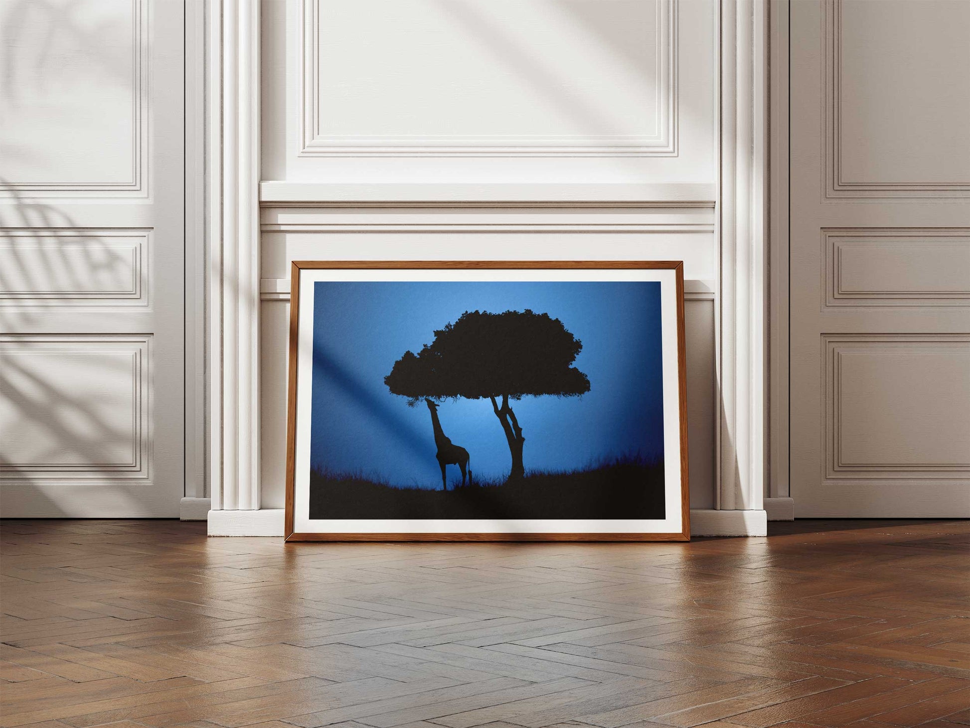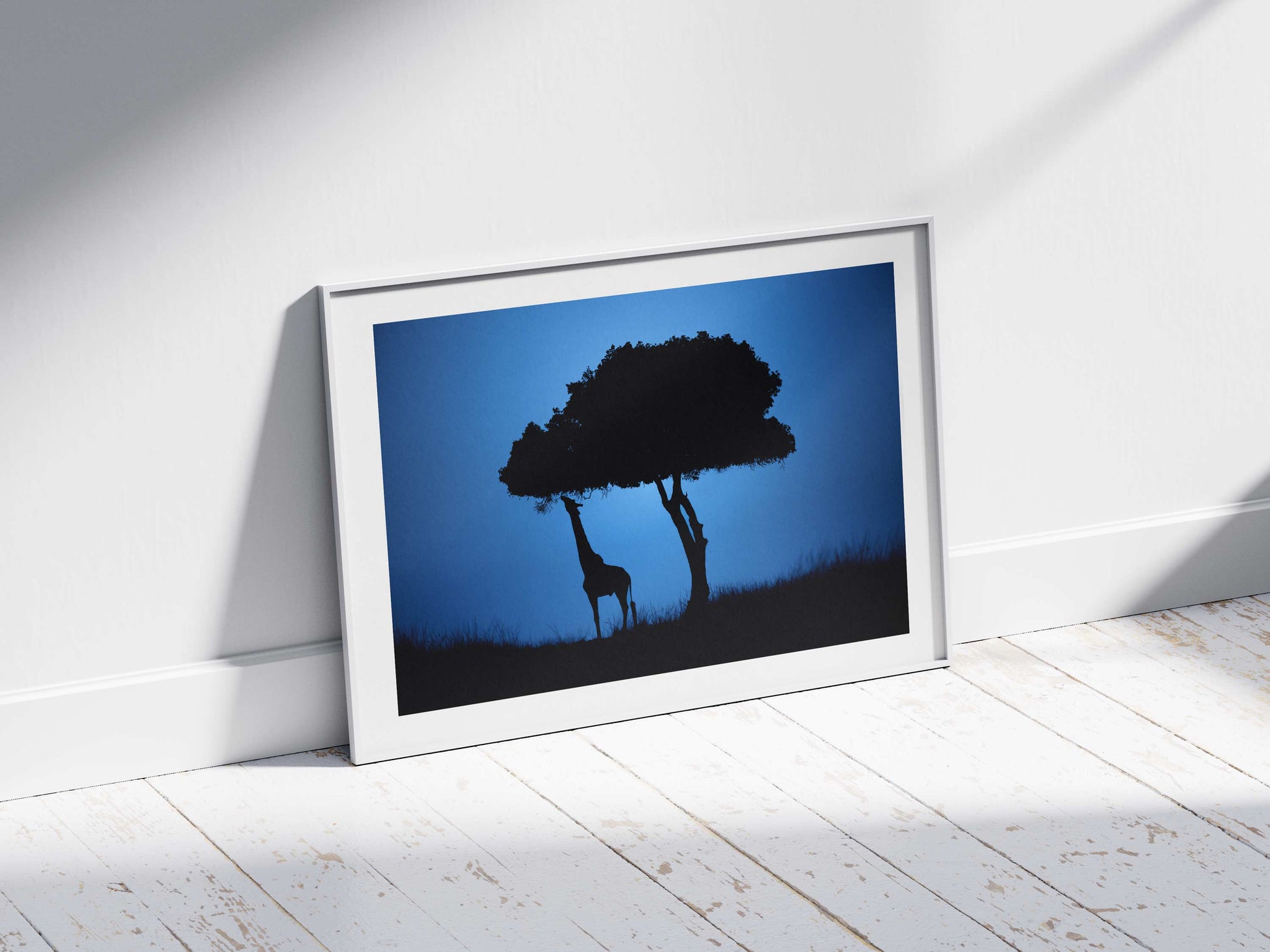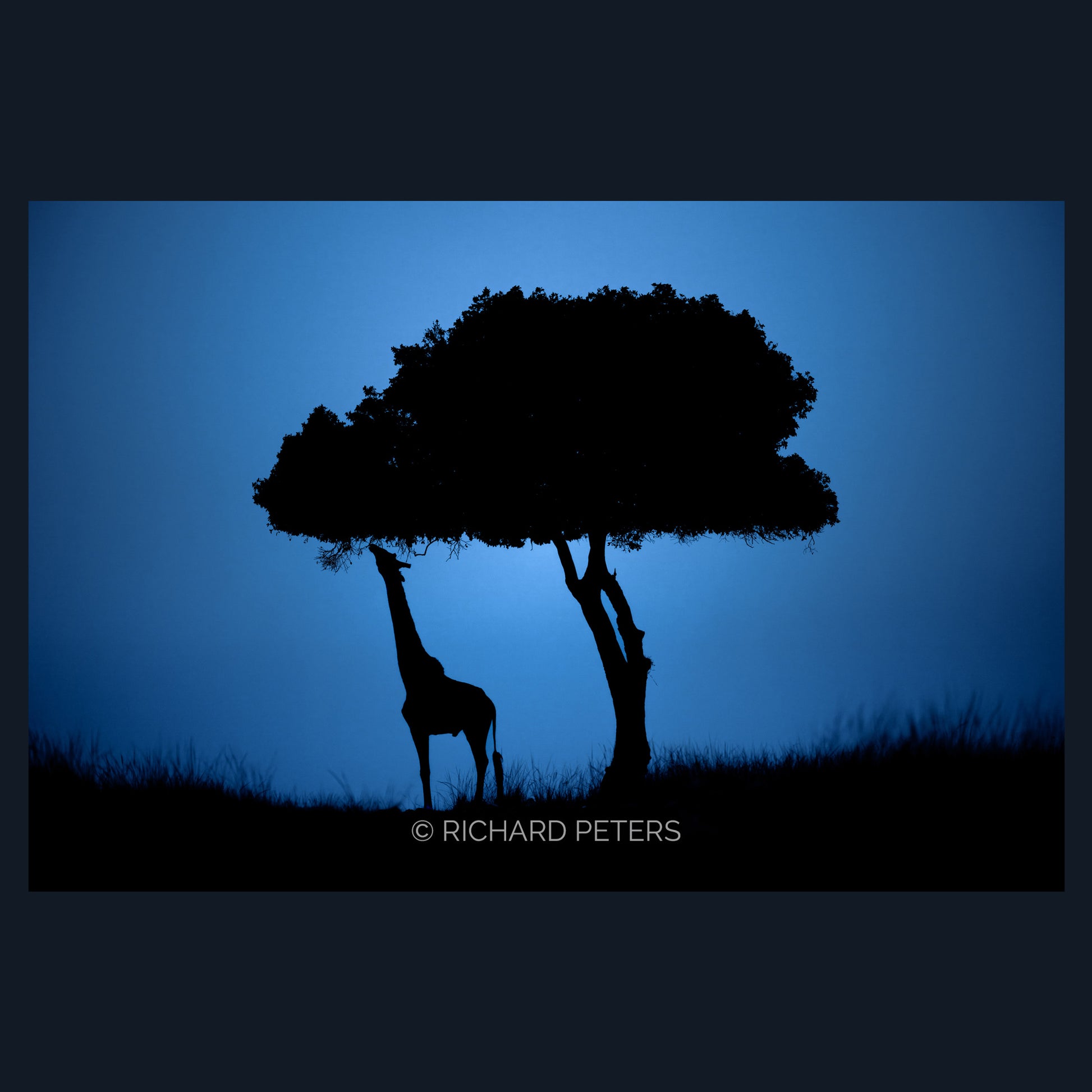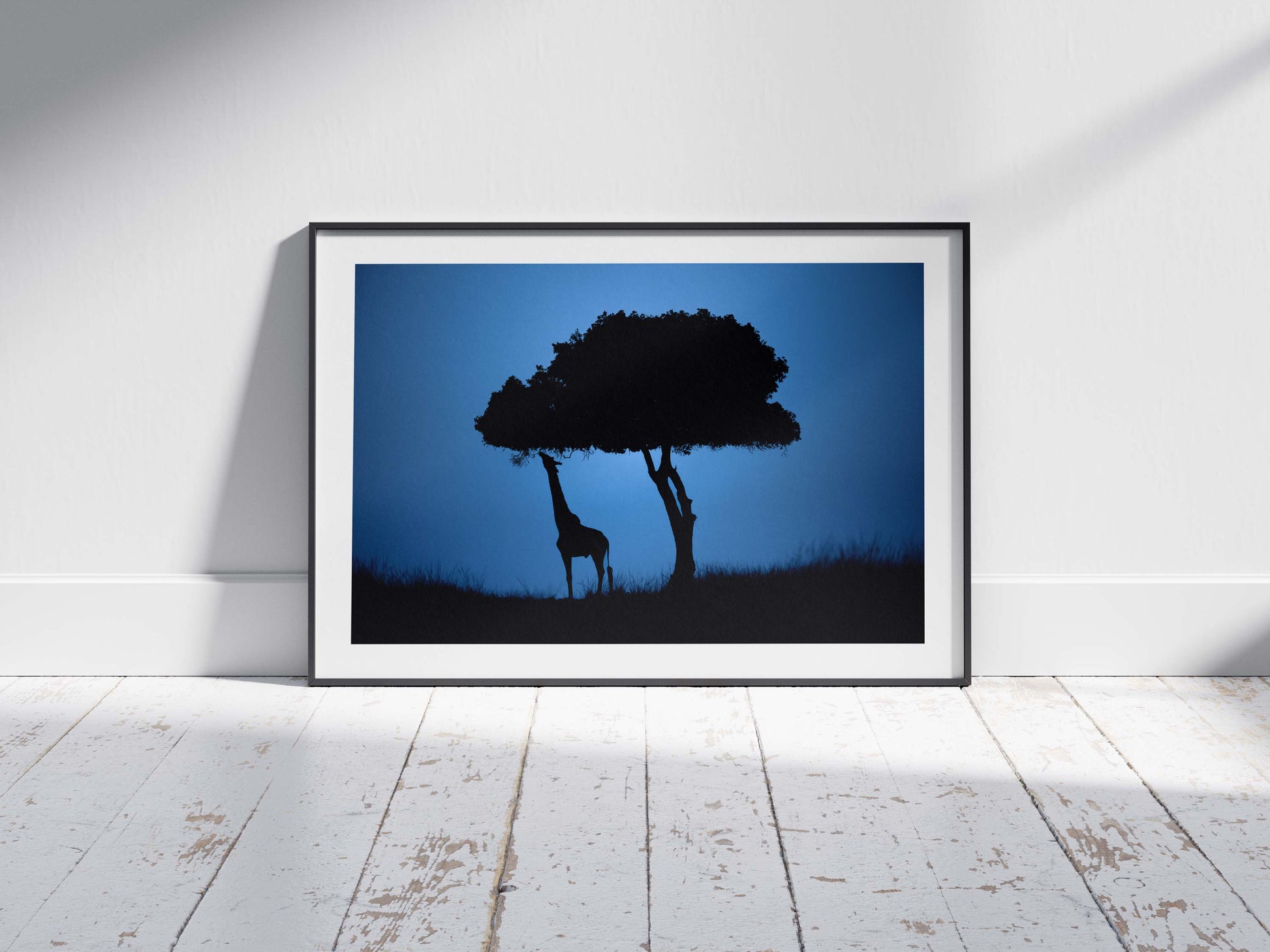 Cool dusk tones help silhouette this lone giraffe under the canopy of an acacia tree. The Maasai Mara is full of these distinct, flat, under-canopy trees as they provide the perfect source of food for giraffe, who can often be found stretching up to the leafy feast above.