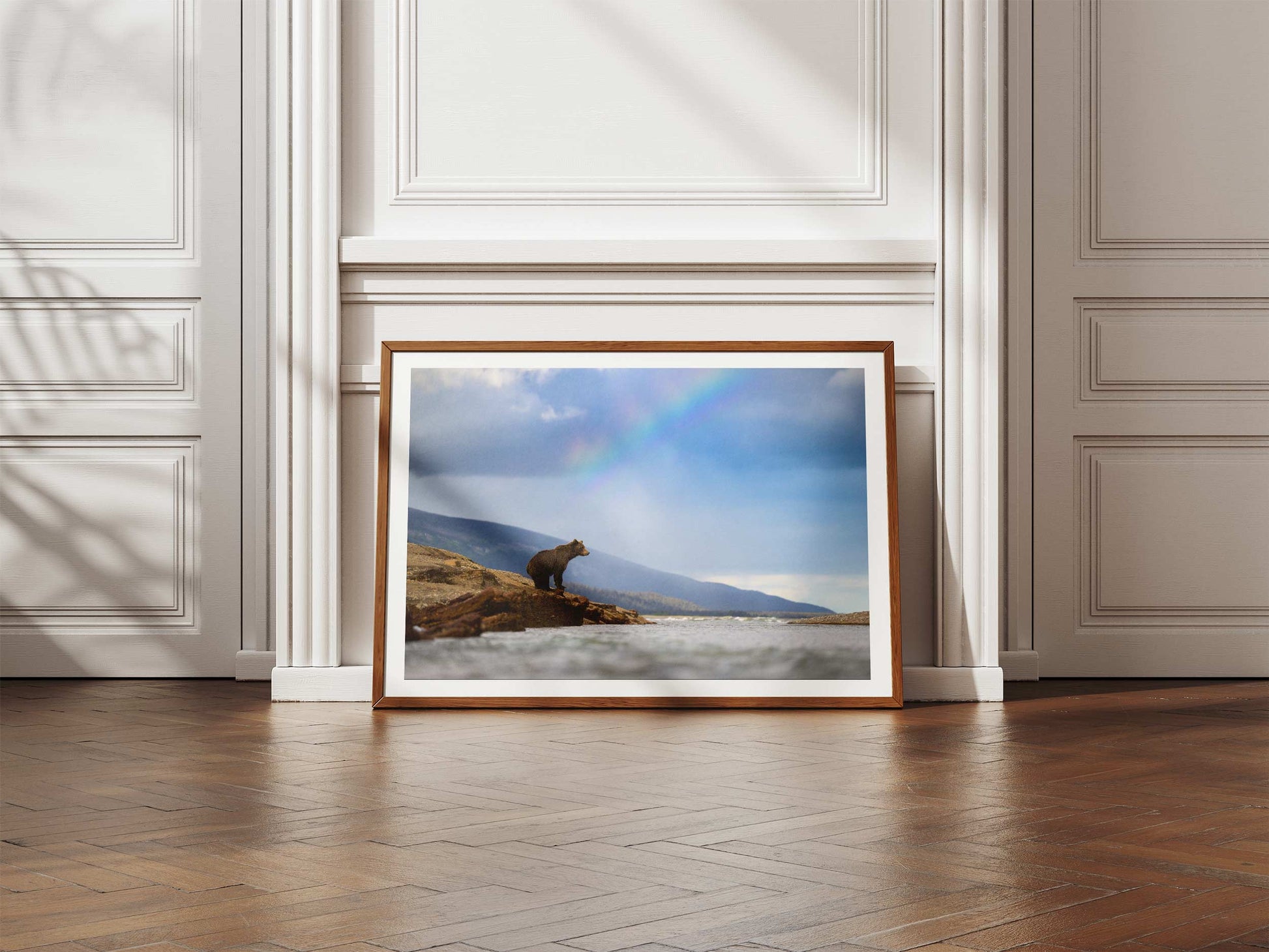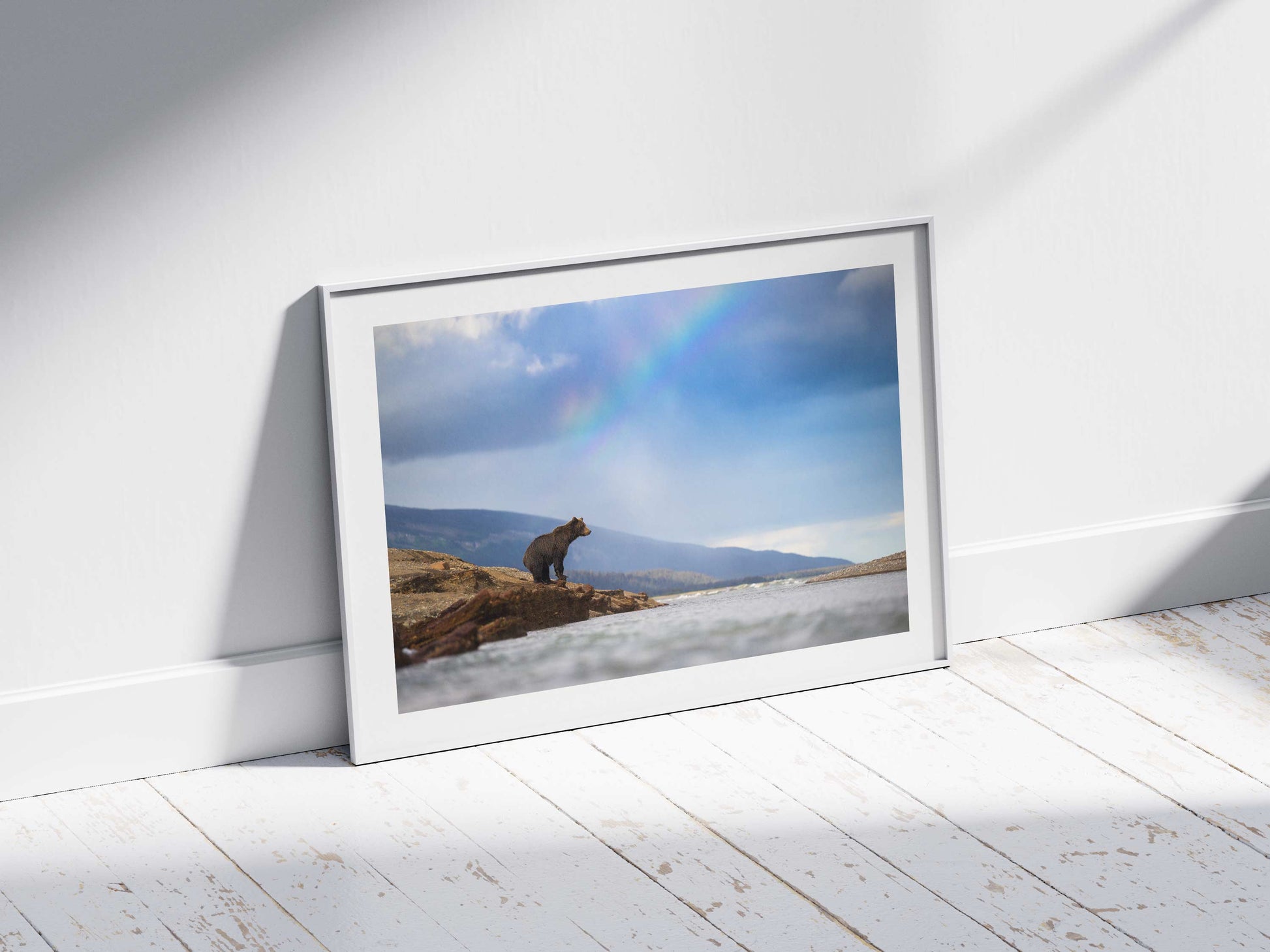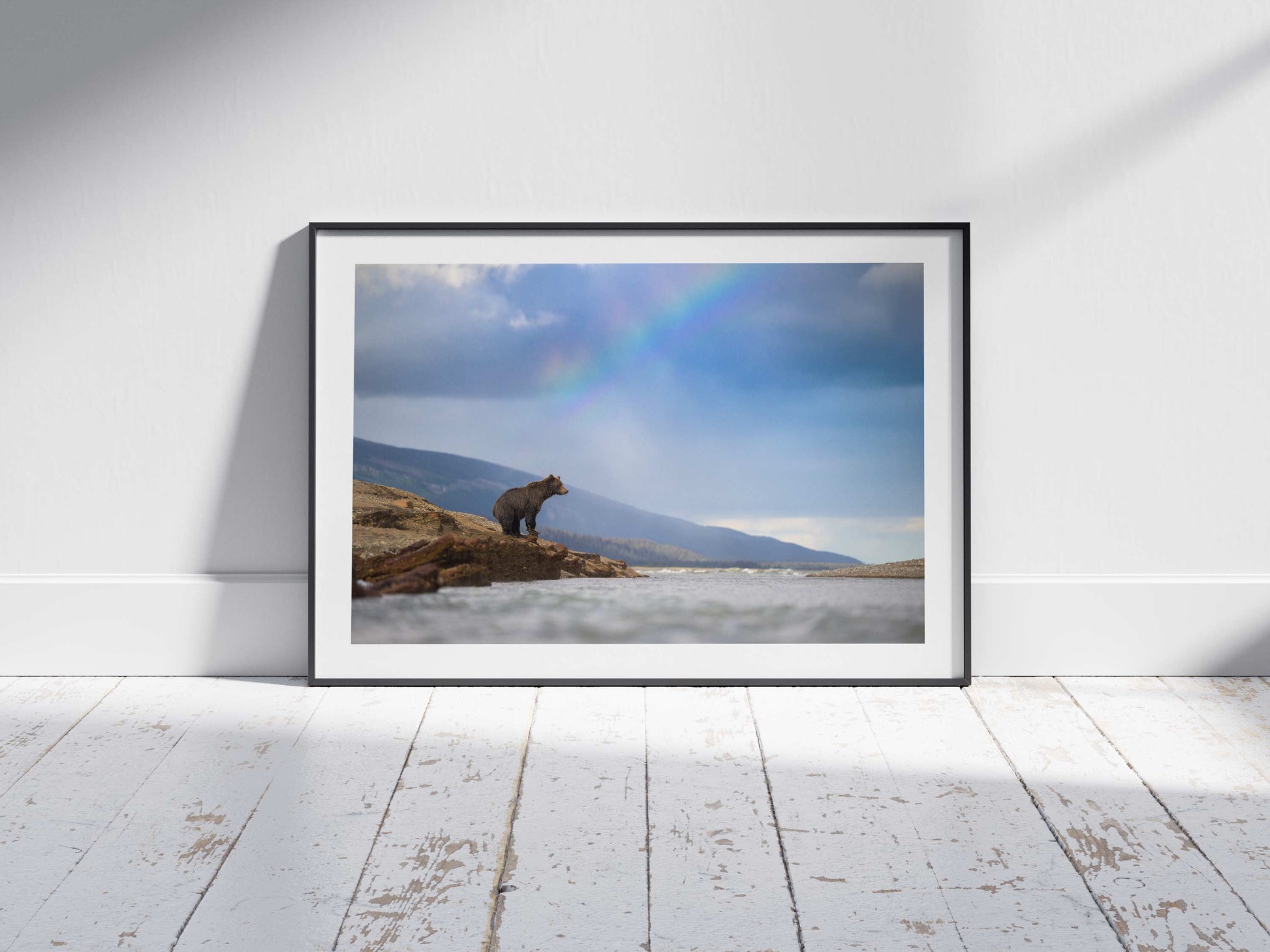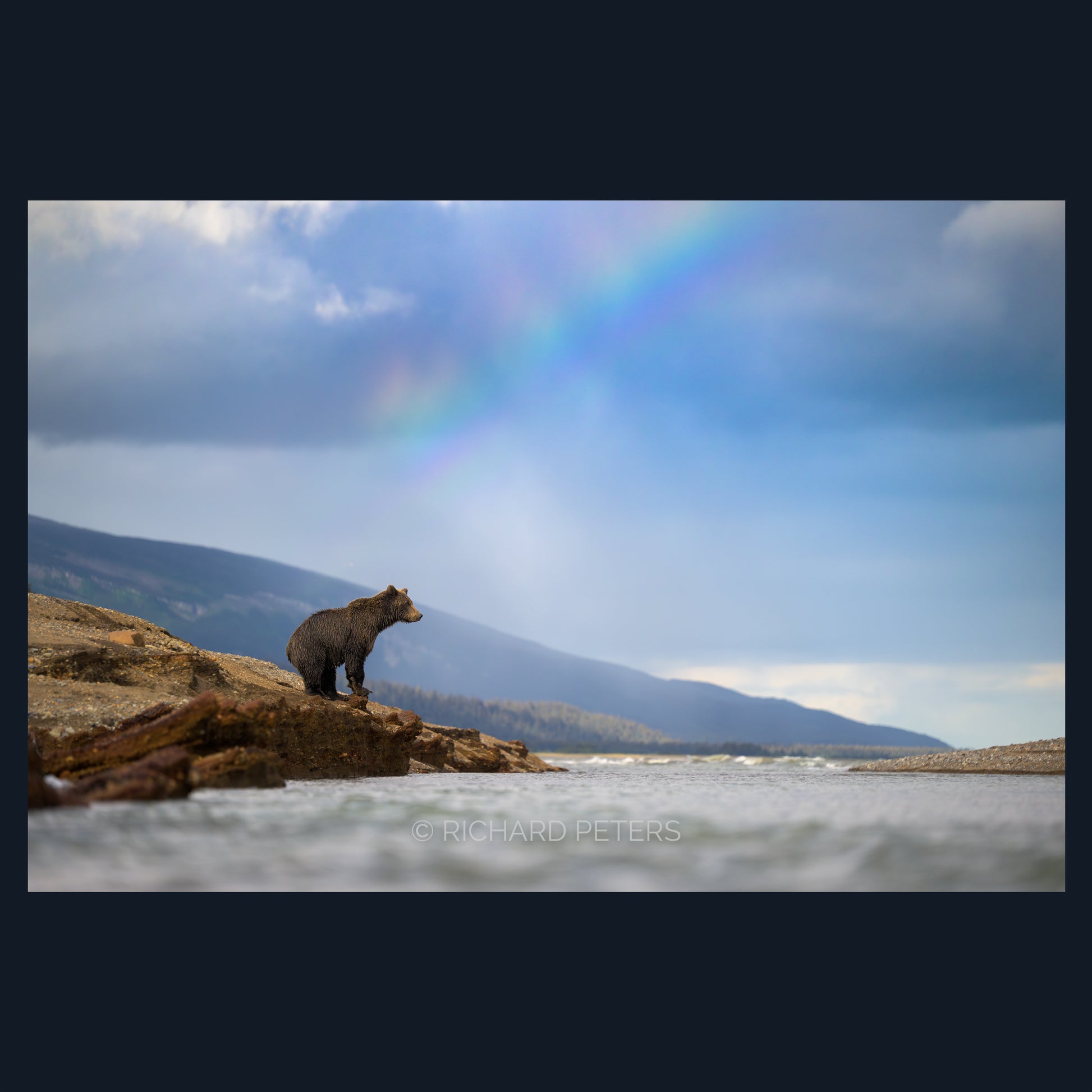 A true one off opportunity. Watching this coastal brown bear hunting for salmon, a beautiful rainbow formed in the distant sky beyond. By getting low to the river bank and holding the camera inches from the water, Richard was able to capture not just the bear in search of a meal, but as much of the landscape behind as possible.
